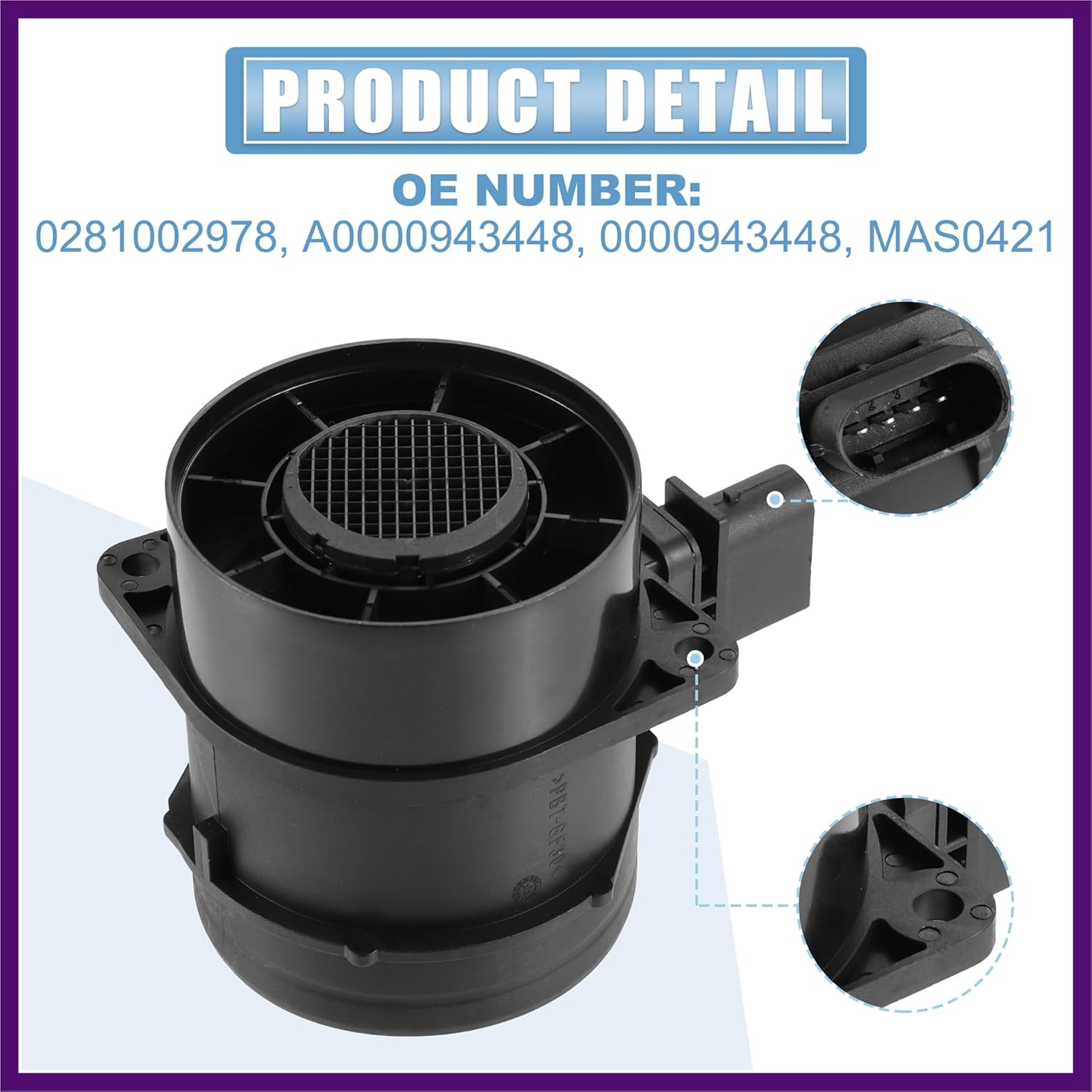Description:Mass air flow sensor allows the vehicle to detect the mass of airflow entering the engine necessary for proper fuel mixture.Mass air flow sensor can easily be located beside the air intake box inside the engine bay.Made of material, good performance and longer lifespan.This is a non-OEM product, accessory only!Specification:Material: Plastic, MetalColor: BlackOE Number: 0281002978, A0000943448, 0000943448, MAS0421,V30720835, AF10511Pin Number: 4Size: 12.7x11.9x9.6cm / 5''x4.69''x3.78''(L*W*H)Mount Hole Size: 6.7mm / 0.26''Fitment:for Mercedes-Benz Sprinter 2500 Base 3.0L V6 - Diesel 2010-2021for Mercedes-Benz Sprinter 3500 Base 3.0L V6 - Diesel 2010-2021for Mercedes-Benz Sprinter 3500 XD Base 3.0L V6 - Diesel 2019 2020Package Includes:1 x Mass Air Flow Sensor Meter